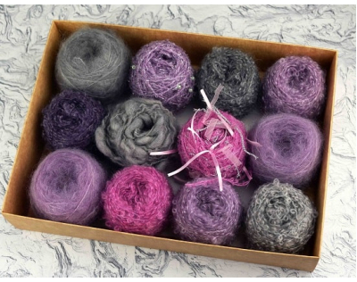 В наборы из пряжи Adele’s Mohair Gift Set входят двенадцать мягких моточков по 25гр., это Boucle, Brushed, Brushed Medium, Bead, Ribbon и Chunky Spun Mohair.