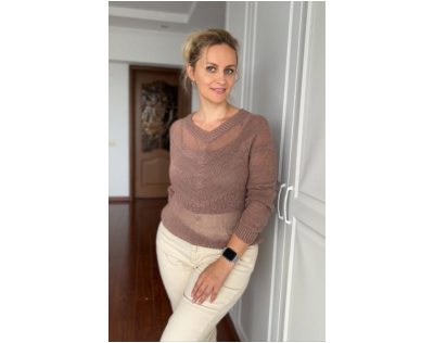 Ниточка с японской бумагой Sato Seni Harmony отлично выглядит в лицевой глади и ажурах, можно создать красивую одежду с аранами. Пряжа достаточно упругая, ровная, гладкая. Вязаное полотно получается пластичным, очень мягким, можно вязать и детскую одежду.