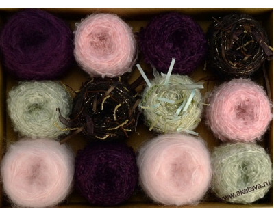 В наборы из пряжи Adele’s Mohair Gift Pack входят двенадцать мягких моточков по 25гр., это Boucle, Brushed Medium и Ribbon.