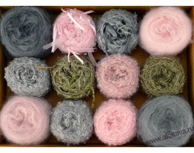 В наборы из пряжи Adele’s Mohair Gift Pack входят двенадцать мягких моточков по 25гр., это Boucle, Brushed Medium и Ribbon.
