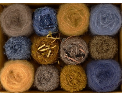 В наборы из пряжи Adele’s Mohair Gift Pack входят двенадцать мягких моточков по 25гр., это Boucle, Brushed Medium и Ribbon.