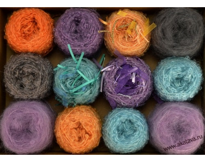 В наборы из пряжи Adele’s Mohair Gift Pack входят двенадцать мягких моточков по 25гр., это Boucle, Brushed Medium и Ribbon.