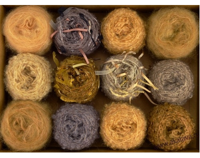 В наборы из пряжи Adele’s Mohair Gift Pack входят двенадцать мягких моточков по 25гр., это Boucle, Brushed Medium и Ribbon.