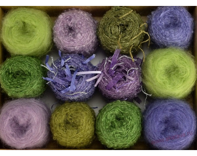 В наборы из пряжи Adele’s Mohair Gift Pack входят двенадцать мягких моточков по 25гр., это Boucle, Brushed Medium и Ribbon.