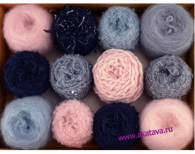 В наборы из пряжи Adele’s Mohair Magic Kit входят двенадцать мягких моточков по 25гр., это Boucle, Brushed, Brushed Medium, Bead, Ribbon и Slubby Merino.
