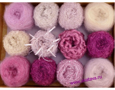 В наборы из пряжи Adele’s Mohair Magical Set входят двенадцать мягких моточков по 25гр., это Boucle, Brushed, Brushed Medium, Bead, Ribbon и Slubby Mohair.