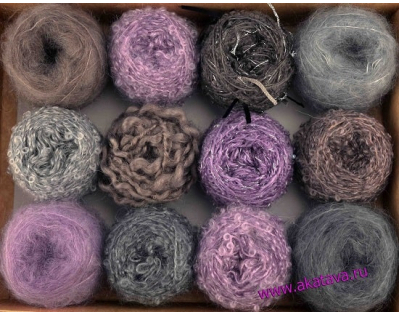 В наборы из пряжи Adele’s Mohair Magical Set входят двенадцать мягких моточков по 25гр., это Boucle, Brushed, Brushed Medium, Bead, Ribbon и Slubby Mohair.