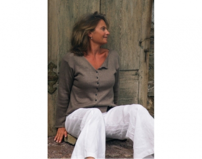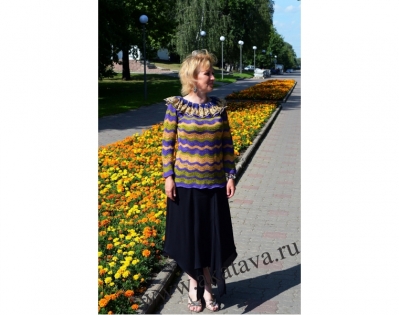 На женскую блузку 46 размера нужно купить всего три моточка льняной пряжи Karin Oberg Kalinka, спицы 3,5мм.