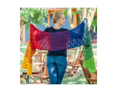 На дополнительных фото представлены модели из секционной пряжи Garnmanufaktur Maya: палантин, бактус, платье мини, поэтому ее можно купить для вязания самых разнообразных смелых проектов.